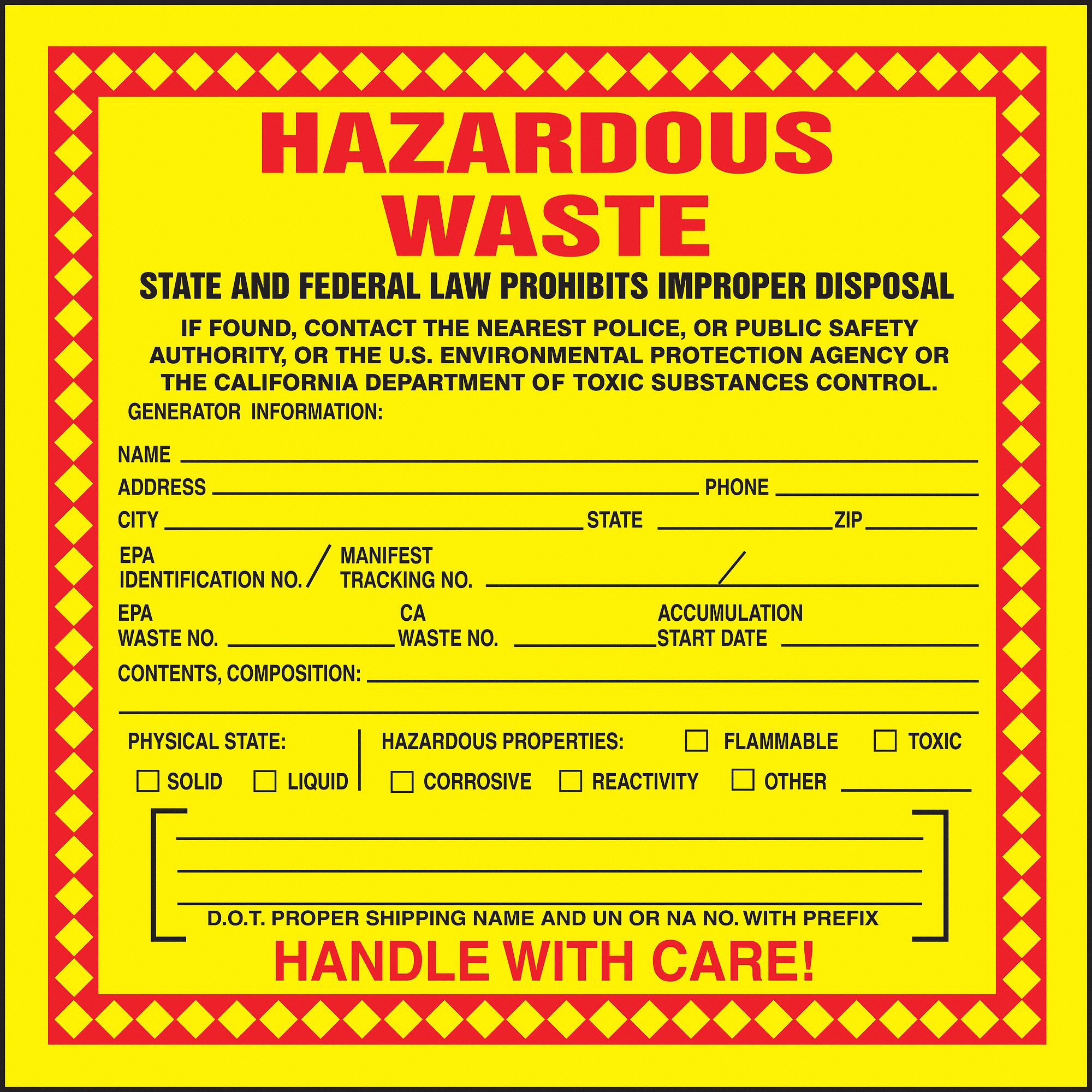 Hazardous Waste Labels - MySafetyLabels.com Hazardous Waste Labels Hazardous Waste Labels (53355) based on 24 customer reviews Mark any hazardous waste drum or non-bulk container. DOT rules require that you include essential information like the shipper's address, a tracking number, and EPA number. Labels should give contact information for the police, a public safety officer, or the EPA. Hazardous Waste Label Sample - Department of Toxic ... hazardous waste state & federal law prohibit improper disposal if found, contact the nearest police or public safety authority, the u.s. environmental protection agency or the california department of toxic substances control. proper d.o.t. shipping name: un or na #: generator's information name: address: PDF HAZARDOUS WASTE - University of Florida Waste Hazard (Check all that apply) Chemical (include all constituents) Total should = 100%, No Abbreviations Approx. Conc. (%) FLAMMABLE OXIDIZER CORROSIVE REACTIVE TOXIC P.I. Bldg. & Room # PLEASE WRITE LEGIBLY FORM# EHS-CWLBL 4/17 . HAZARDOUS WASTE. Author: Doty, Matthew Created Date: 12/7/2018 11:41:38 AM ... Hazardous Waste Labels | Brady | BradyID.com Hazardous waste labels, or hazmat labels, are an effective way to identify containers, cylinders and drums holding hazardous waste. They will help notify and warn your employees about these potentially dangerous materials in your facility, as required by industry regulations. Can't find the right label?