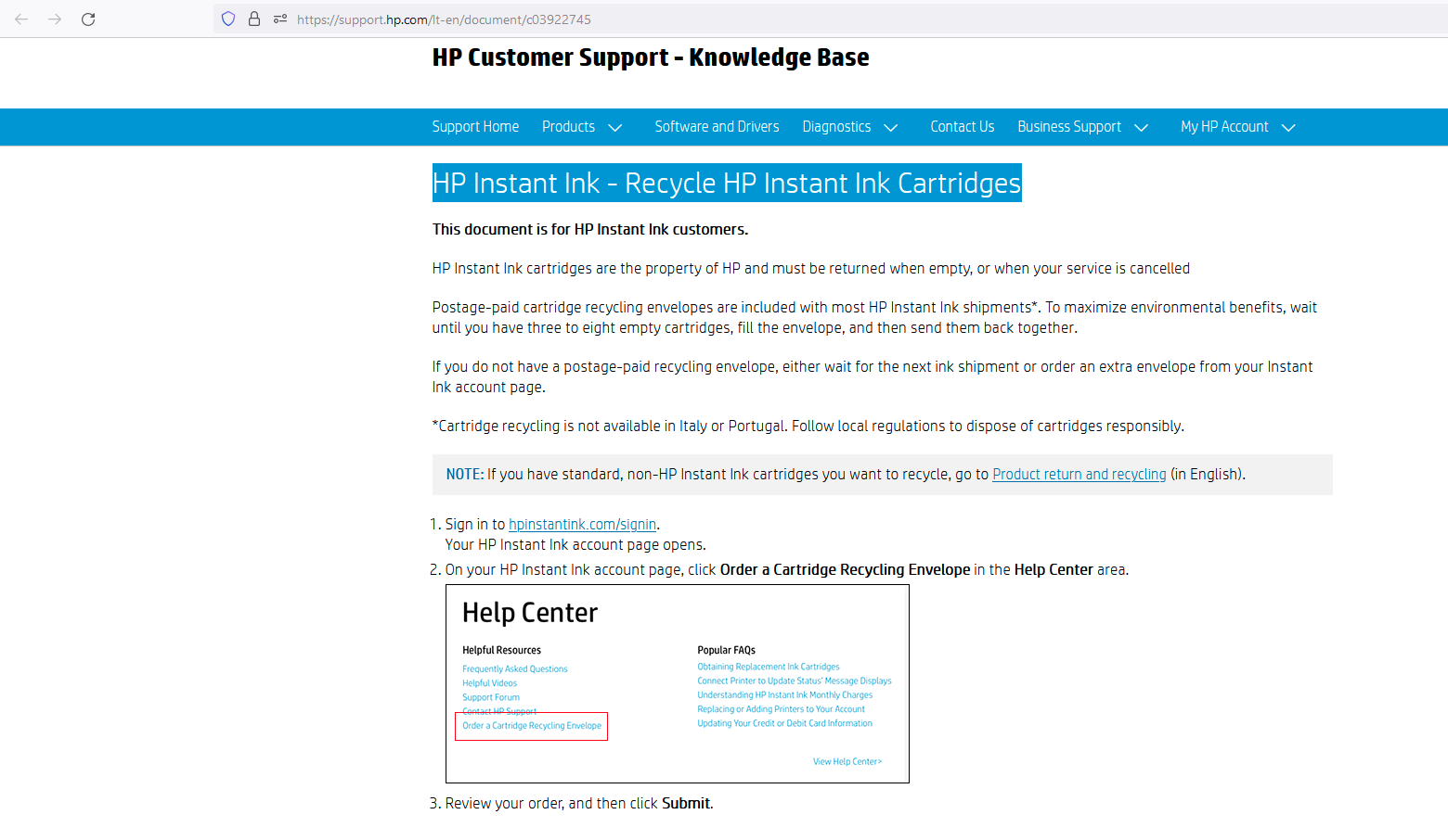Solved: InstantInk link to order a Cartridge Recycling envelope is 24 Feb 2019 — On your HP Instant Ink account page, click Order a Cartridge Recycling Envelope in the Help Center area. You may follow the steps suggested from ...