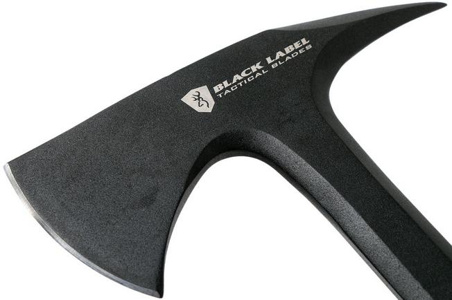 Browning Black Label Shock N' Awe Tomahawk (2.75" Black ... - Blade HQ This intimidating combat tomahawk offers a black powder-coated sword-grade blade forged from 1055 stainless steel. The curved penetration spike puts a serious hole in hardened targets. The unique Black Label Tactical Blades logo adorns the side of the blade. Its one-piece handle with spiked pommel is hand-wrapped with black nylon paracord and has a generously-sized lanyard hole.