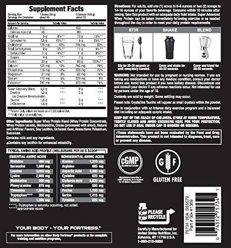 Body Fortress Super Advanced Whey Protein Powder, Chocolate, 60g ... Body Fortress Super Advanced Whey Protein is the ideal post-workout protein supplement featuring 100% Premium Whey enhanced with Creatine and other critical Amino Acids. For adults, add one (1) scoop to 6-8 ounces or two (2) scoops to 14-16 ounces of your favorite beverage. Consume within 10 minutes after mixing.
