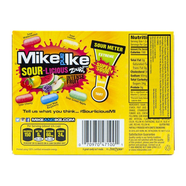Mike & Ike Fruit Punch Sour-Licious Candies, 0.78 oz - Kroger Cholesterol 0mg 0%. Sodium 25mg 1%. Total Carbohydrate 19g 7%. Dietary Fiber 0g 0%. Sugar 13g. Protein 0g. *The % Daily Value (DV) tells you how much a nutrient in a serving of food contributes to a daily diet. 2,000 calories a day is used for general nutrition advice. Ingredients.