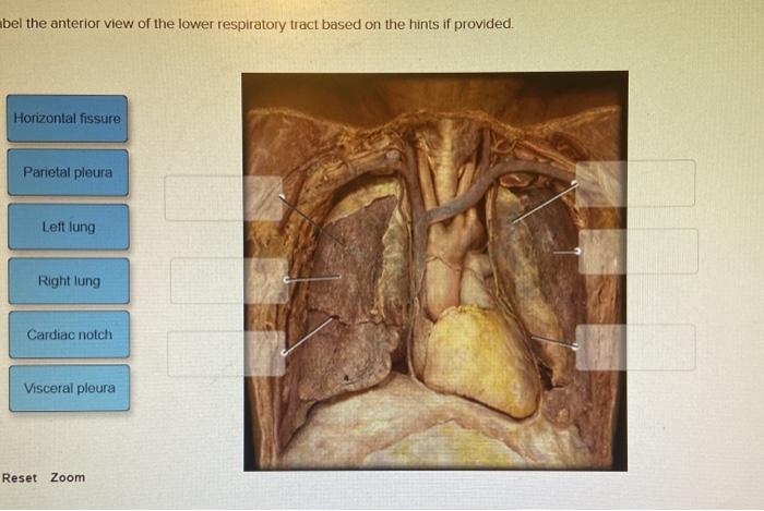 Solved Label the anterior view of the lower respiratory - Chegg Question: Label the anterior view of the lower respiratory tract based on the hints if provided. Horizontal fissure Visceral pleura Left lung Right lung Parietal pleura Cardiac notch Reset Zoom This problem has been solved! See the answer Show transcribed image text Expert Answer 100% (5 ratings) If satisfied with the answer please thumbs up 👍.