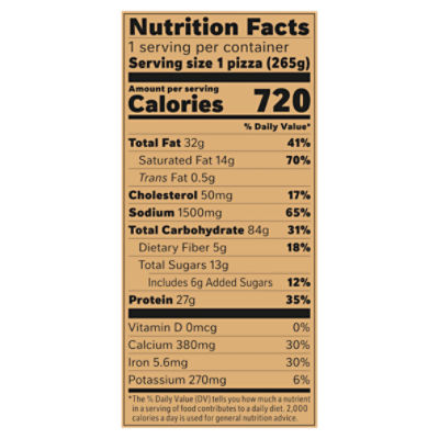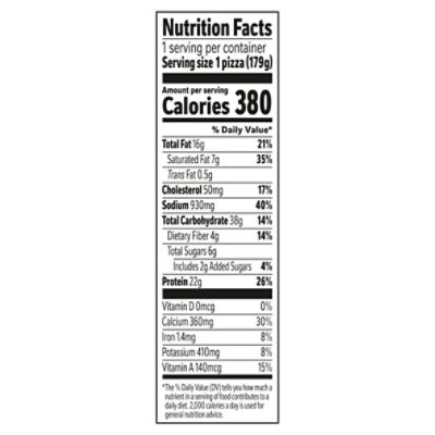 Jack's pepperoni pizza nutrition label. Jack's Original Thin Crust Pepperoni Frozen Pizza - 14.3oz One 14.3 oz Jack's Original Thin Crust Pepperoni Frozen Pizza. Jacks thin crust pizza made with real cheese for the perfect combination of thin crust and delicious toppings. Topped with spicy pepperoni slices, signature sauce and mozzarella cheese. Frozen pepperoni pizza made with preservative-free crust. Perfect for a quick dinner on busy ... Calories in Jack Link's Pepperoni Beef Stick and Nutrition Facts 20g. Carbs. 1g. Prot. 11g. There are 230 calories in 1 super size stick (50 g) of Jack Link's Pepperoni Beef Stick. Calorie Breakdown: 79% fat, 2% carbs, 19% prot. Original Pepperoni Sausage. Calories in Jack's Original Pepperoni Pizza and Nutrition Facts - FatSecret Original Pepperoni Pizza Nutrition Facts Serving Size 1 serving (156 g) Amount Per Serving Calories 380 % Daily Values* Total Fat 18.00g 23% Saturated Fat 8.000g 40% Trans Fat - Cholesterol 45mg 15% Sodium 830mg 36% Total Carbohydrate 39.00g 14% Dietary Fiber 2.0g 7% Sugars 4.00g Protein 18.00g Vitamin D - Calcium - Iron - Potassium - Jack's Original Thin Crust Sausage and Pepperoni Frozen Pizza, 15 oz ... Nutrition facts. Refer to the product label for full dietary information, which may be available as an alternative product image. 3.0 Servings Per Container. ... One 15 oz Jack's Original Thin Crust Sausage and Pepperoni Frozen Pizza; Jack's frozen thin crust pizza made with real cheese for the perfect combination of thin crust and delicious ...