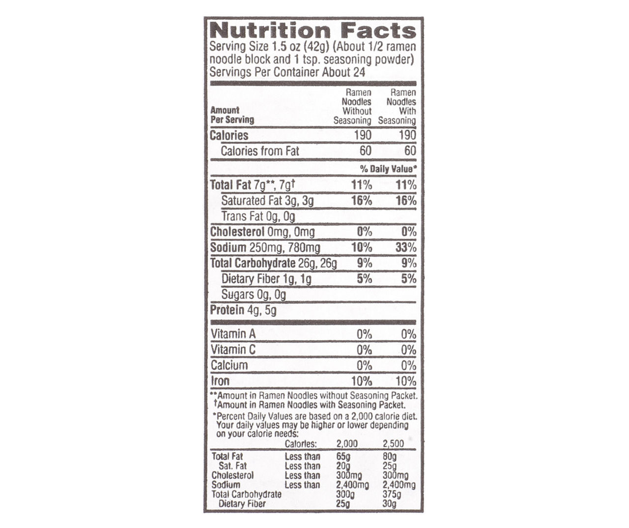 Ramen Nutrition Facts and How to Make Them Healthier - Verywell Fit Take a look at the label and you'll see there are two servings per package. This means that half of the package of ramen noodles has about 190 calories, 27 grams of carbohydrates, and 7 grams total fat, including 3 grams of saturated fat. And the worst culprit? One package of ramen noodles has about 1,330 milligrams of sodium. 1