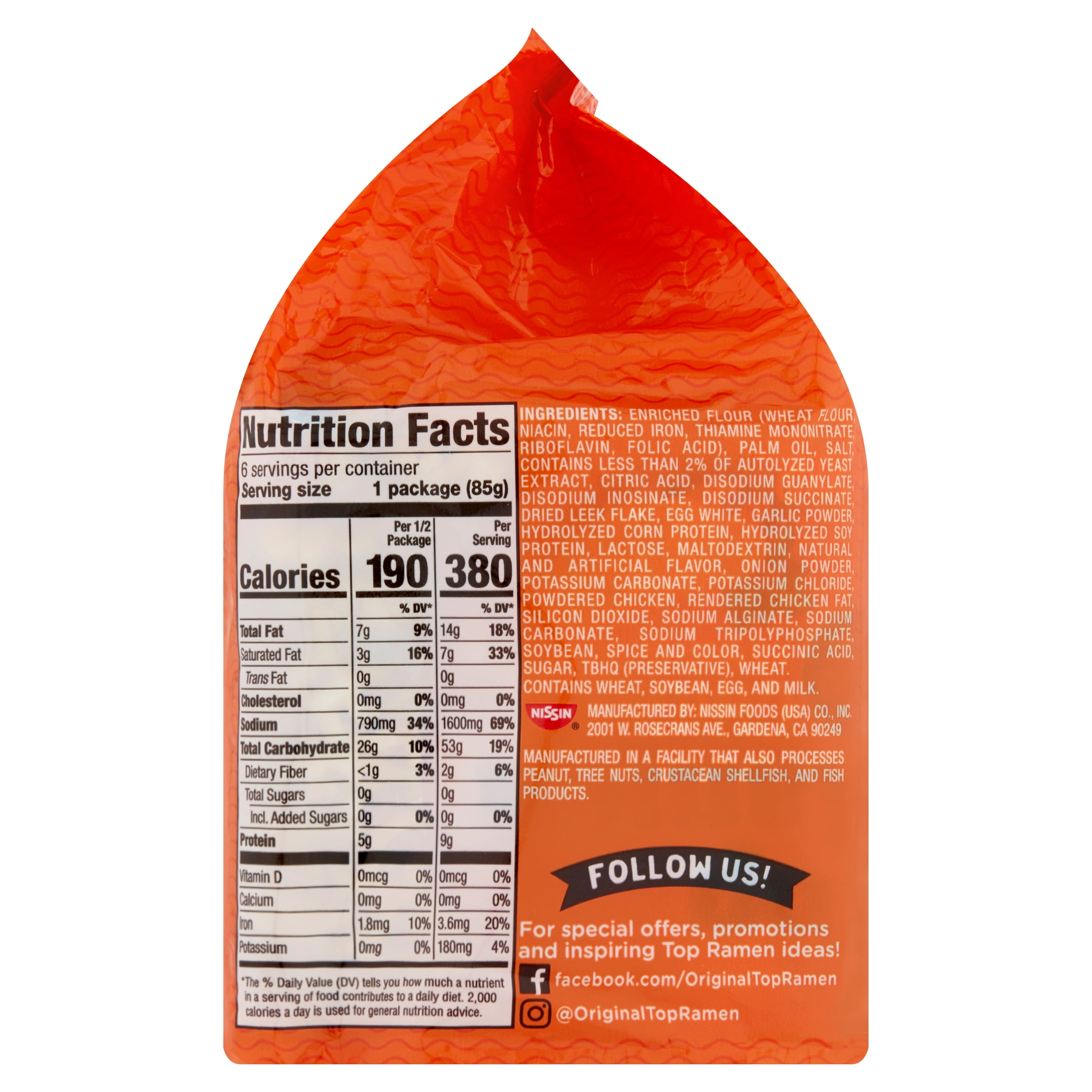 Nissin | Top Ramen - All your favorite flavors Delicious as is or tossed with your favorite ingredients, Top Ramen is always a simple pleasure. Find your flavor - even vegetarian options available. ... Top Ramen - Beef: Nutritional Facts. Serving Size 1 package (85g) Servings Per Container 1. Amount Per Serving Per 1/2 Package Per Serving; Calories 190, 380 % Daily Value* Total Fat 7g ...