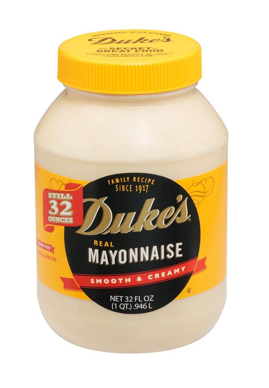 Settling Wilmington's great mayo divide: Duke's vs. Hellmann's Duke's Mayonnaise Duke's was created by Mrs. Eugenia Duke at Duke's Sandwich Shop in Greenville, South Carolina, in 1917. It is the third largest brand in the U.S. behind Hellmann's and... Homemade Duke's Mayo — Schmoe Farm Ingredients. 1 large egg (room temperature) 1 tablespoon plus 1 teaspoon distilled white vinegar 2 teaspoons apple cider vinegar* (see note) 1 teaspoon Dijon mustard Duke's Light Mayonnaise - Duke's Mayo Duke's Light Mayonnaise has the same great taste and creamy texture as Duke's Real Mayonnaise, but with half the calories and fat. As of February 2021, Duke's Light Mayonnaise has no added sugar, just like our real and other flavored mayos. You can substitute Duke's Light Mayonnaise for Duke's Real Mayonnaise in any of our recipes. Packaging Size Duke's Mayo | It's Got Twang! Duke's Light Mayonnaise Add To Cart Light Mayonnaise with Olive Oil Add To Cart Hint of Lime Mayonnaise Add To Cart Bacon & Tomato Flavored Mayo Add To Cart Habanero Garlic Flavored Mayo Sold Out HOUSE OF TWANG! OUR RECIPES Dill Pickle Deviled Eggs view recipe Pea Salad view recipe Spiral Ham view recipe Classic Pimento Cheese view recipe