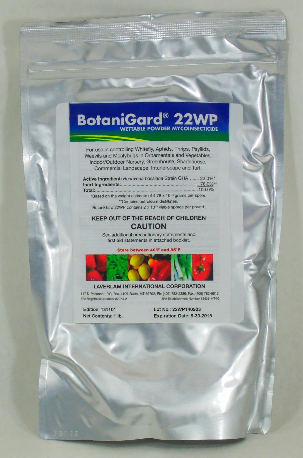 Labels for BOTANIGARD 22WP (82074-2) | US EPA Labels for BOTANIGARD 22WP (82074-2) | US EPA Labels for BOTANIGARD 22WP (82074-2) You will need Adobe Reader to view some of the files on this page. See EPA's PDF page to learn more. Provided below is the information for the Product/Registration number selected. Labels Chemical Alt. Brand Name Inactive Alt. Brand Name Transfer History Site Pest Botanigard WP - Others insecticide Botanigard WP is a proven bio-pesticide containing 220 g/kg of the entomopathogenic fungi Beauveria bassiana for the control of whitefly in various protected crops.. DIRECTIONS FOR USE IMPORTANT: This information is approved as part of the Product Label. All instructions within this section must be read carefully in order to obtain safe and successful use of this product.